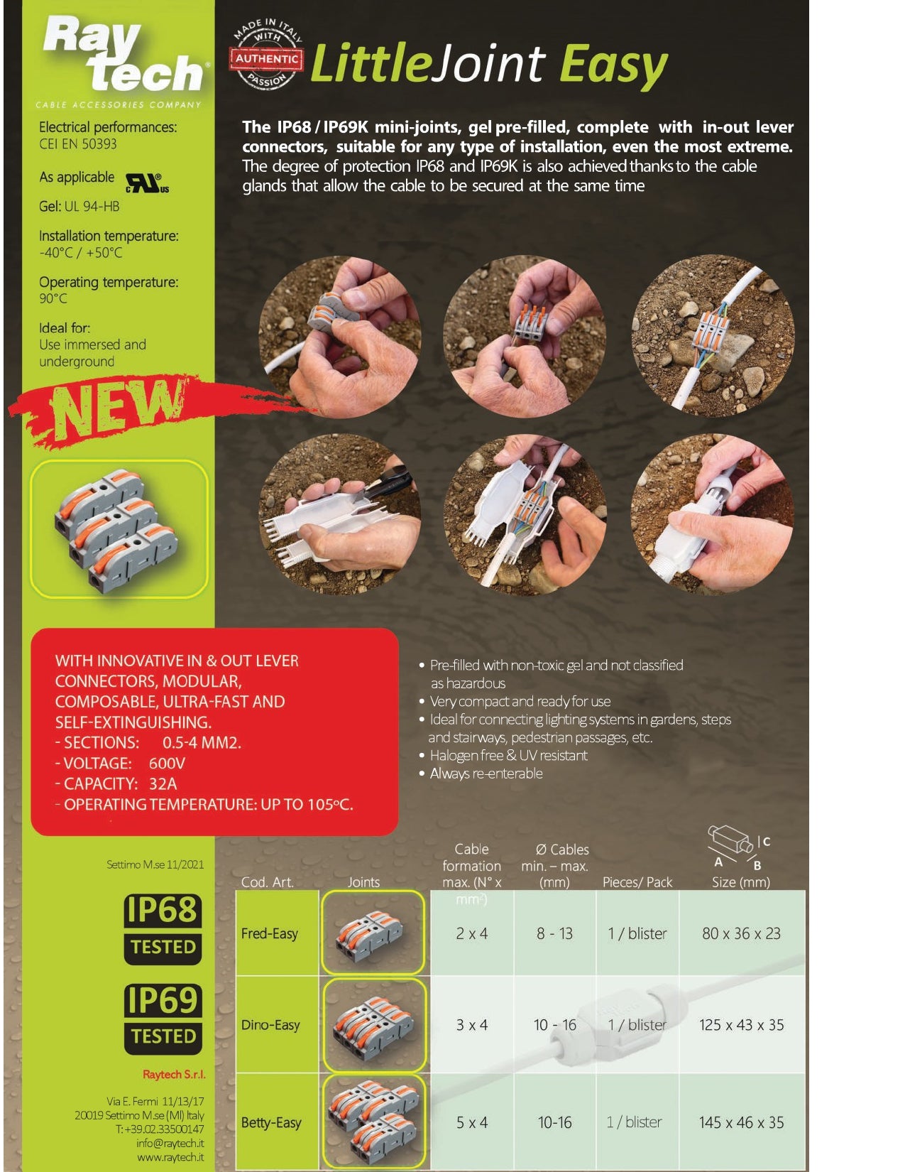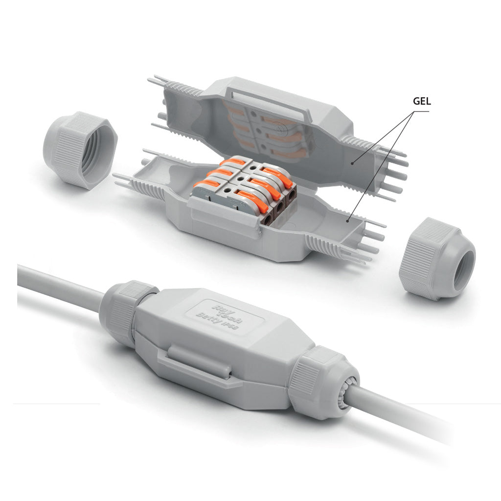 The Raytech Little Joint Easy IP68/IP69K Gel Cable Junction Box is a compact waterproof electrical connector designed for outdoor, underground, and submersible cable connections. Pre-filled with non-hazardous insulating gel, this ready-to-install waterproof junction box provides long-term protection against water, moisture, dust, and environmental exposure.