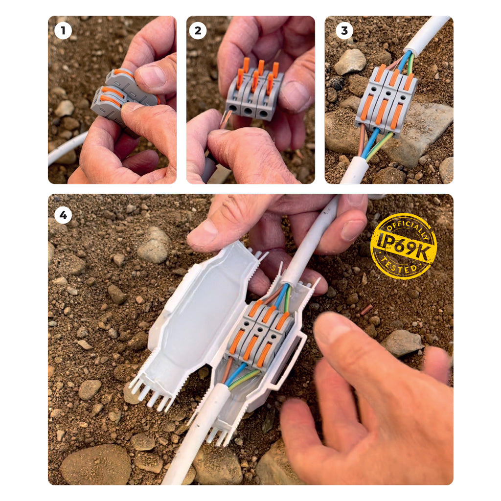 Designed with integrated cable glands and lever connectors, the Little Joint Easy creates a secure electrical connection while locking the cable in place, making it ideal for garden lighting, landscape lighting, outdoor wiring, stair lighting, pedestrian crossings, and harsh installation environments.